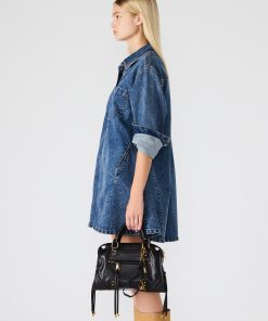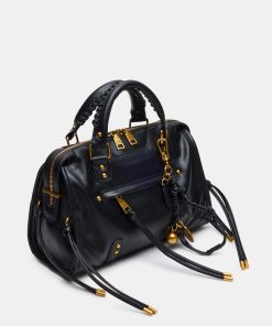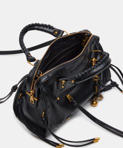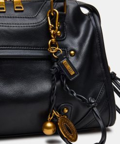 Expertly crafted with a slouchy satchel design, this RIGGS bag is a top-handle bag that combines style and function. Featuring dome stud details and knotted fringe decals on a gusset with rounded bottom metal aglets, it also comes with an attachable crossbody strap for versatile wear—a must-have for any fashion-forward wardrobe.