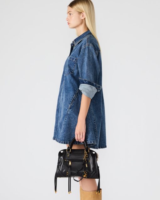 Expertly crafted with a slouchy satchel design, this RIGGS bag is a top-handle bag that combines style and function. Featuring dome stud details and knotted fringe decals on a gusset with rounded bottom metal aglets, it also comes with an attachable crossbody strap for versatile wear—a must-have for any fashion-forward wardrobe.