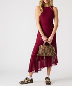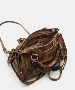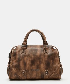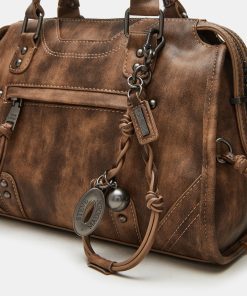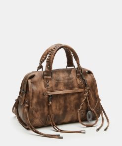 Expertly crafted with a slouchy satchel design, this RIGGS bag is a top-handle bag that combines style and function. Featuring dome stud details and knotted fringe decals on a gusset with rounded bottom metal aglets, it also comes with an attachable crossbody strap for versatile wear—a must-have for any fashion-forward wardrobe.