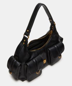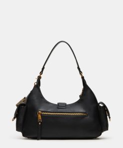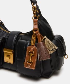 The ISSAC BAG BLACK is a versatile cargo shoulder bag designed for organized, everyday use. Featuring multiple functional pockets, a magnetic snap tab, and secure zipper closures, it offers practical storage solutions. Inside, standard organization compartments keep essentials neatly arranged, while a back zipper adds easy access. The bag is accented with a distinctive tassel horse-bit chain, combining style with utility for a refined, expert look.