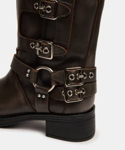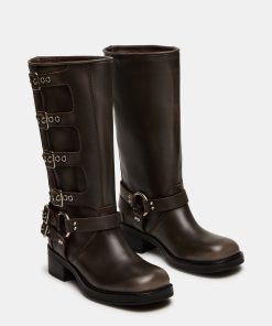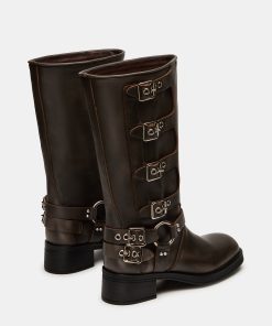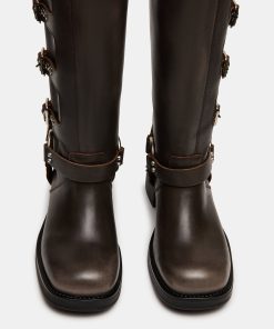 The ROCKY BROWN DISTRESSEDWIDE CALF knee boot features the wide profile of an engineer boot with harness and buckle hardware adding an industrial edge and giving the design an adjustable fit.
